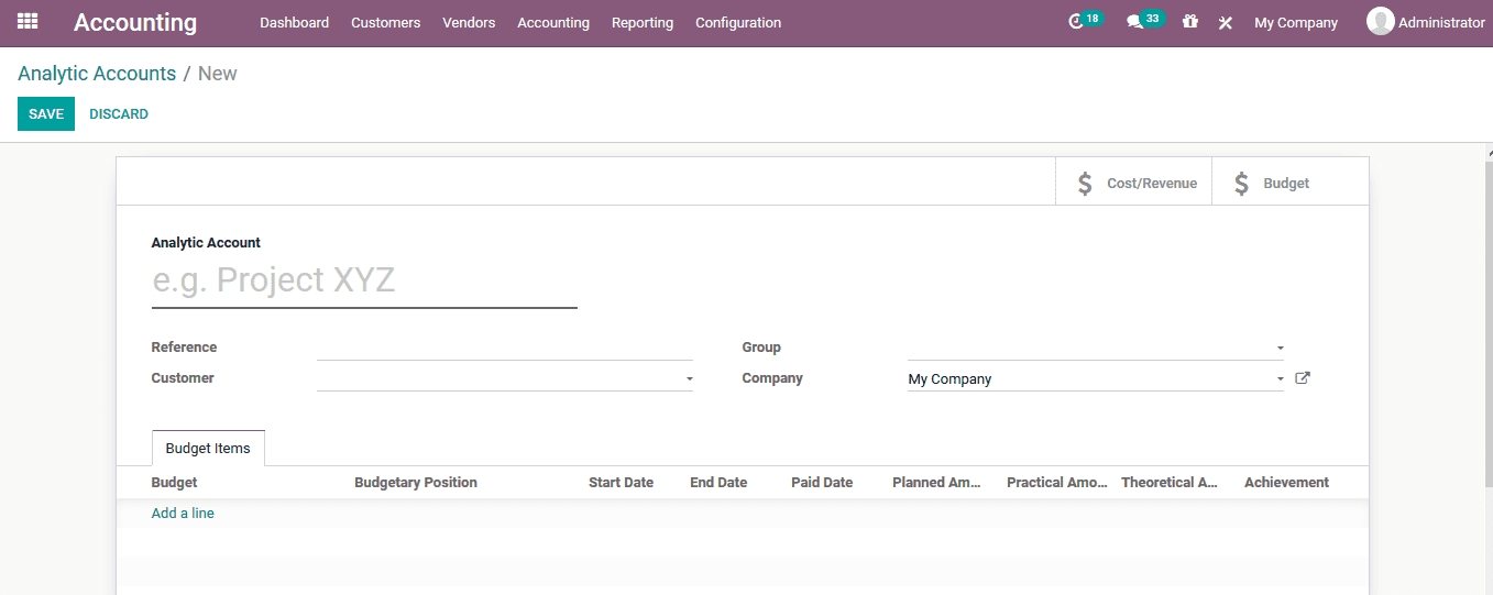 The analytical accounts for the platform can be created by selecting the create option available. The user can provide a name for the analytical account, reference number, customer details, allocate a group and the budget lines can be defined under the budget items.