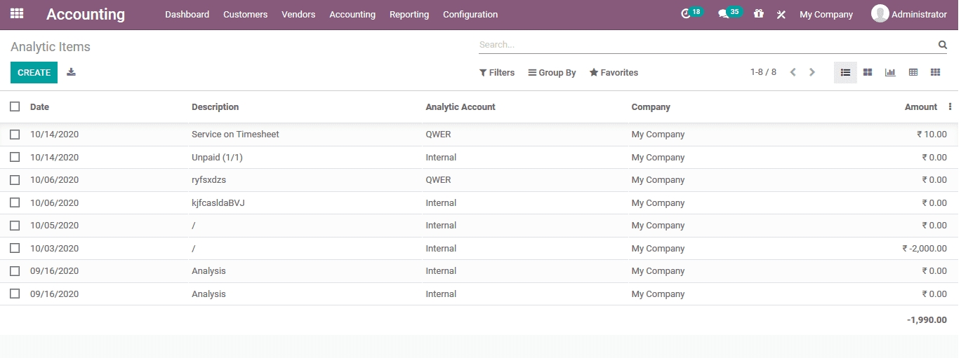 Now back in the analytical items menu accessible from the configuration menu of the module the user will be depicted with all the accounting aspects of the company.