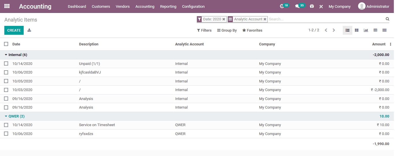 On selecting an respective entry the user can view all the details of the same analytical account operation and the invoice details allocated with the respective account.