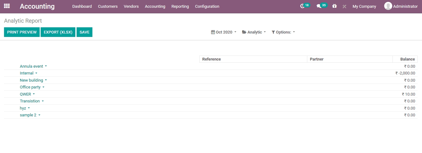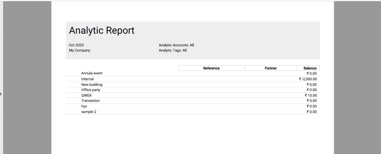 As the filtering operations are completed the user can view all the analytical accounts and their profit and loss statements.