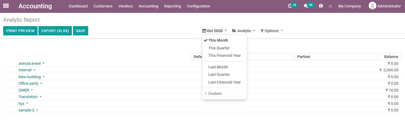 The user can export the analytical reports to an external source using the export option which can be done on XLSX file. In addition, the user can select the print preview option to view the preview of the report which we generated if subjected to be printed