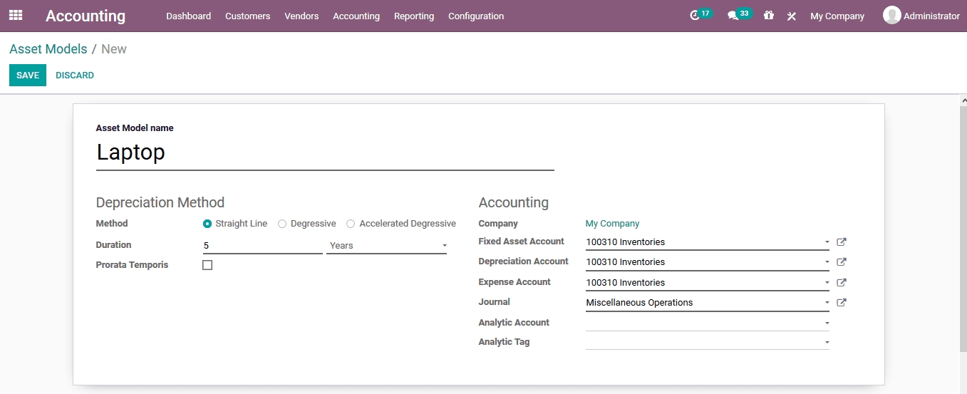 In the new asset creation window the user can assign an asset model, allocate the depreciation method to be a straight line, digressive or accelerated degradation. Additionally, allocate the duration and the prorata temporis. Under the accounting menu the user can describe the accounting aspect of the asset such as fixed asset account, depreciation account, expense account, journal, analytical account and analytical tab.
