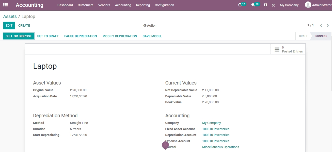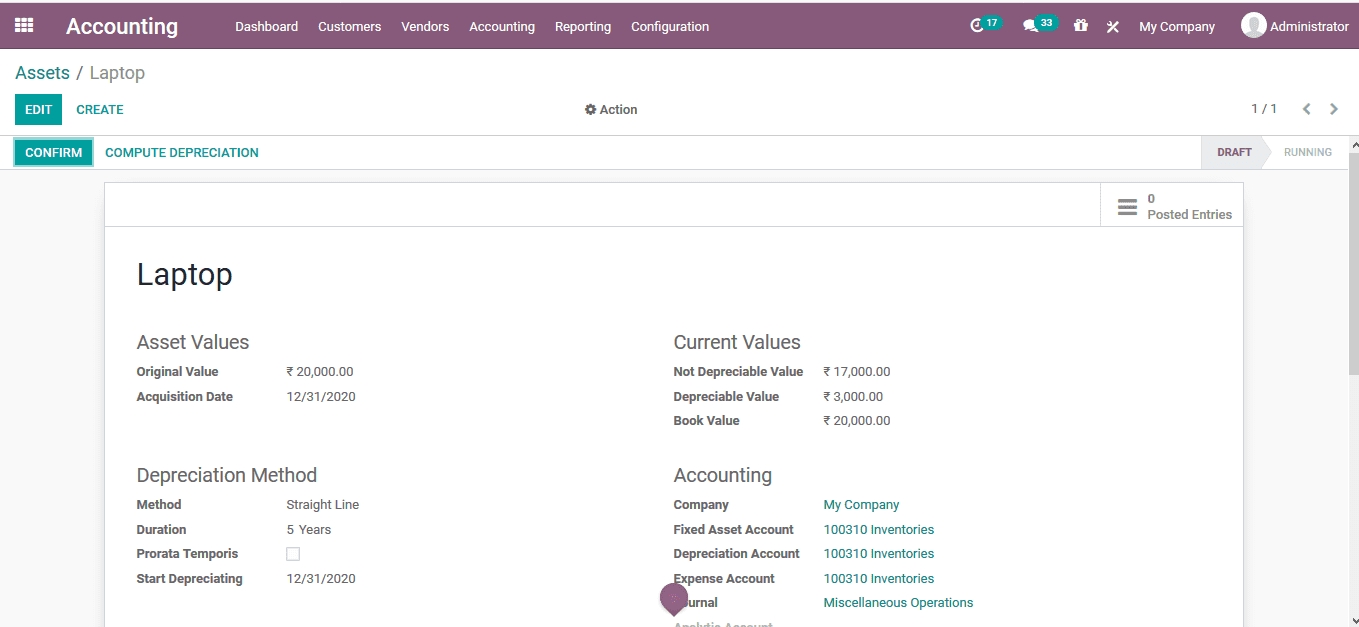 Furthermore, the depreciation method can be allocated and the duration of the depreciation and the start date of the depreciation can also be allocated. Moreover, the accounting aspects of the asset can be described under the menu such as depreciation account, expense account, journal of entry, analytical account and the analytical tab can be described.