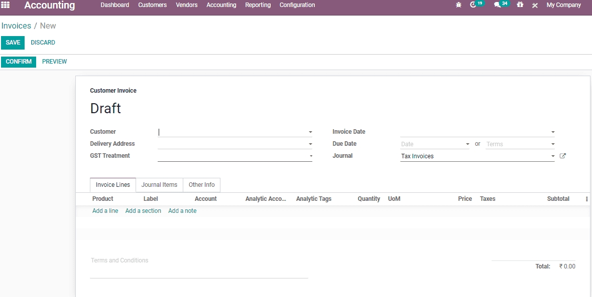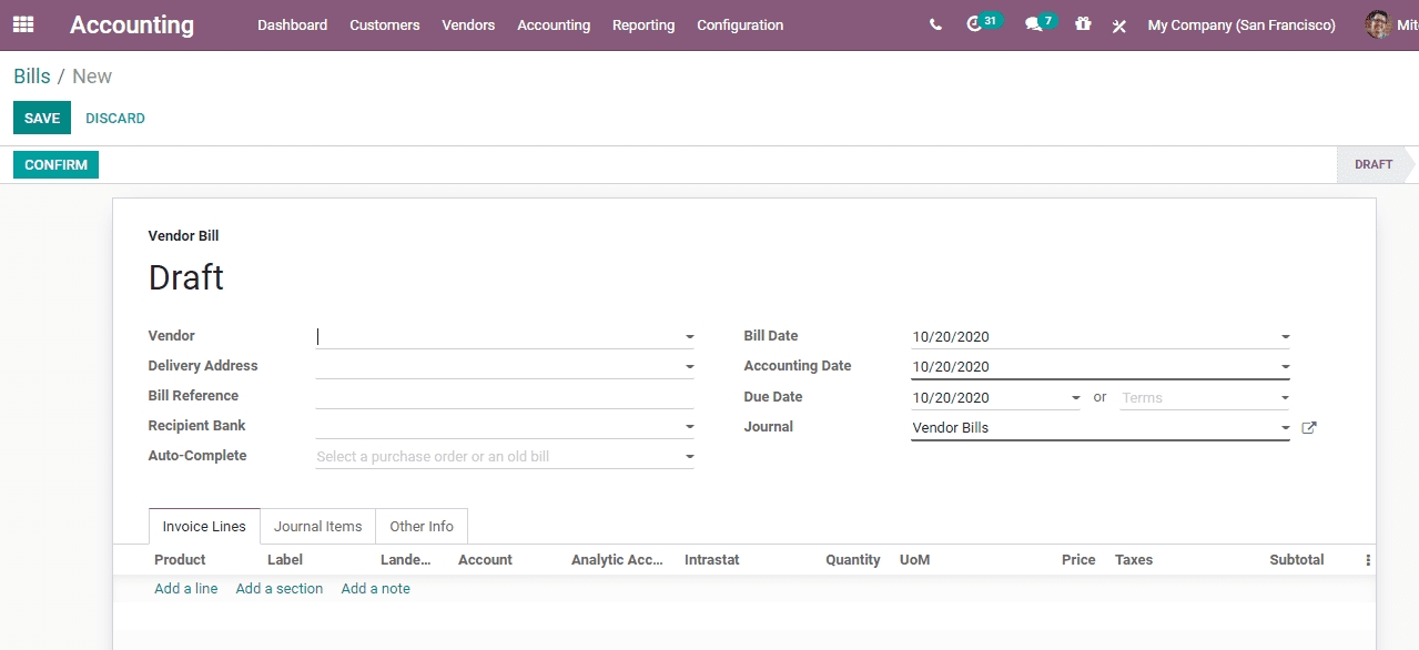 The user can easily register the new vendor bill here by choosing the vendor. This can also be done by contributing their invoice as the Vendor Reference. The user is also able to add and confirm the product lines. A user has to be alert to entre correct product quantities, taxes/expenses and prices.