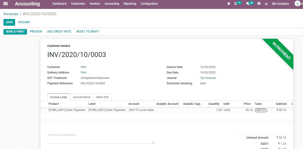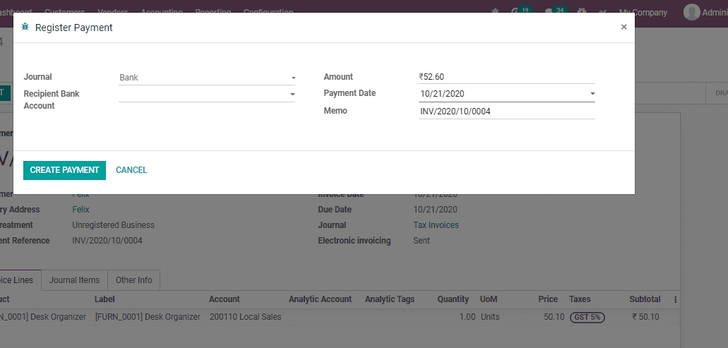 Usually, a company accountant handles the bank statements only during weekends. It is at this time that the invoices are marked as paid. It is done so as to remember that the service with our customer can be started. Payment confirmation is send from the customer side, so payment registration can be done and the invoice can be marked as paid. Click REGISTER PAYMENT option. Then the user will get a new window to Create Payment. Fill in necessary details and click CREATE PAYMENT. Then the invoice status will be changed to in payment.