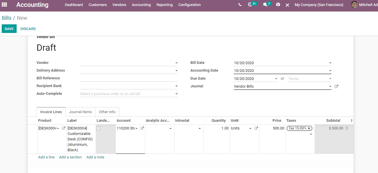 This feature can be configured in two different ways. First method is to click the option New Bill from Accounting Dashboard under Vendor Bill section. The second option is to go to Accounting>Vendors>Bills.