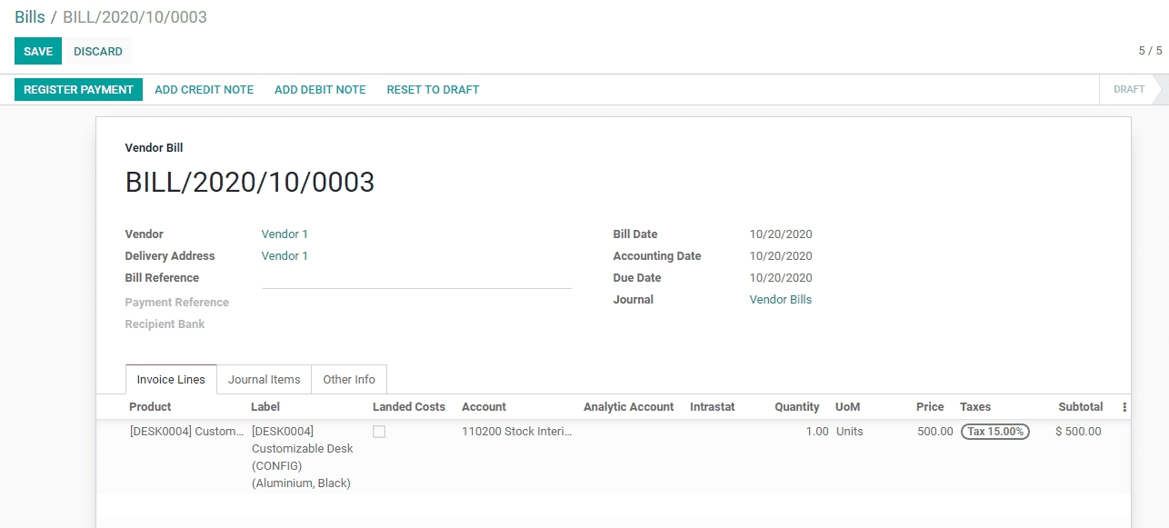 Here, the user can easily register the new vendor bill by choosing the vendor and contributing their invoice as the Vendor Reference. The user can also add and confirm the product lines. Here, one has to be careful to ensure correct product quantities, taxes/expenses and prices.