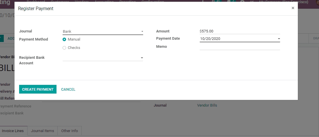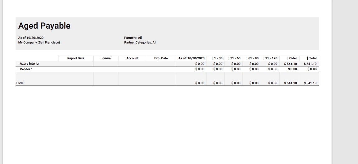 A user can pay vendors the correct amount at the right time (not too late, not very early; contingent upon the vendor policy) if the vendor bills are registered or enlisted in Odoo. The process becomes effortless with Odoo. Odoo also helps to generate reports to follow your aged payable balances.