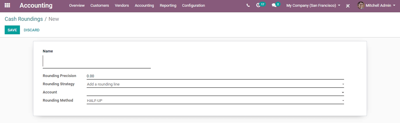 Cash rounding is an important feature for any type of business. IT is this feature that enables the vendor to round off the cost of any request when instalment is made. Odoo supports cash rounging. Odoo also helps the user to round the total amount of a bill to the nearest 5 cents. A vendor using Odoo will be able to create a bill with a rounded total amount.