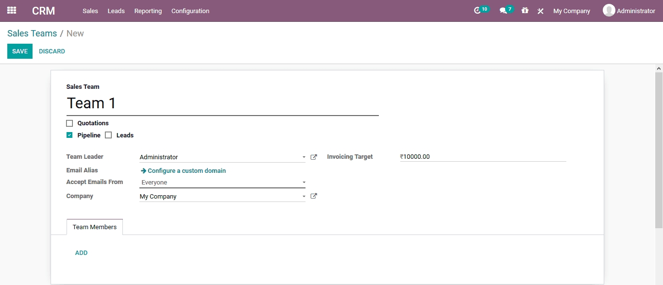 To create a new sales team the user can select the create option available. In the creation menu the user can provide a name, allocate it to quotations, pipeline operations and leads. An associated team leader can be selected along with the invoicing target if the company operates based on the sales target terminology.