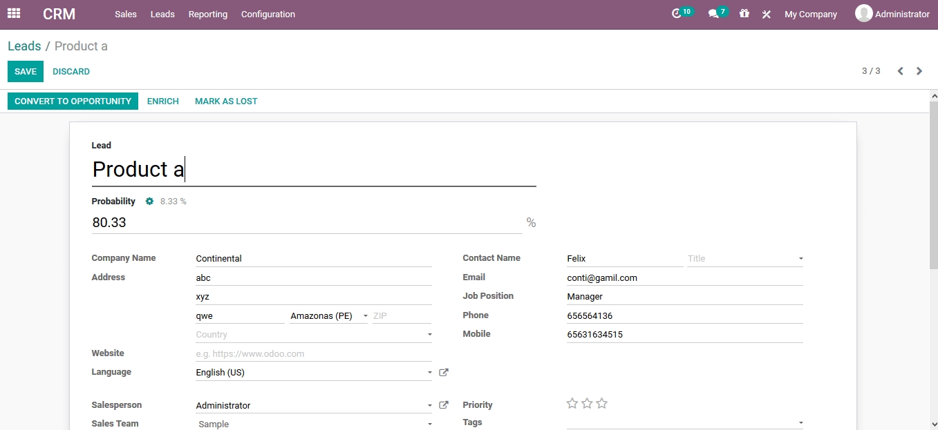 To create a new lead, the user can select the create option available from the lead menu. The description of the lead along with probability of acquiring it can be mentioned. The company or the customer name along with the contact details can be described in the window.