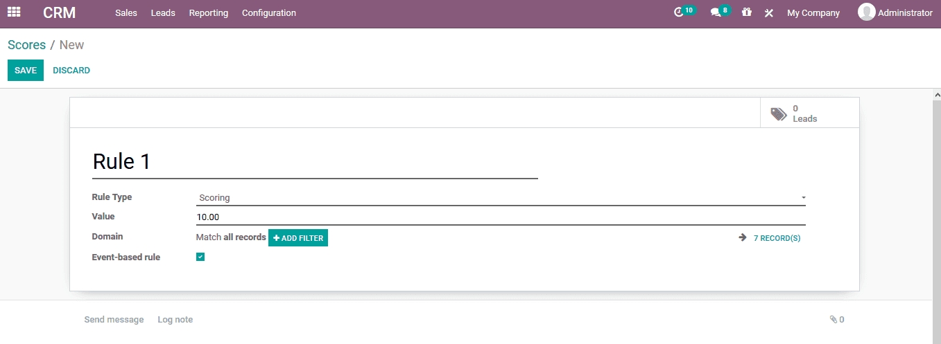 Once the score rule module is installed from the applications module of the SIMISE platform the user will be able to view a new tab for the menu of scoring rules in the CRM dashboard. The user can select this menu and create a new scoring rule. The modifications on the existing ones can also be carried out. The rule name, rule type and the value of the scoring can be allocated. In addition, a domain can be allocated, these can be of multiple domains and the event based rule option can be enabled.