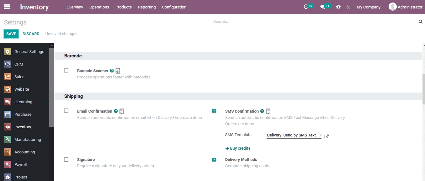 After enabling the shipping methods option the user can view the shipping method menu in the configuration tab of the inventory module.