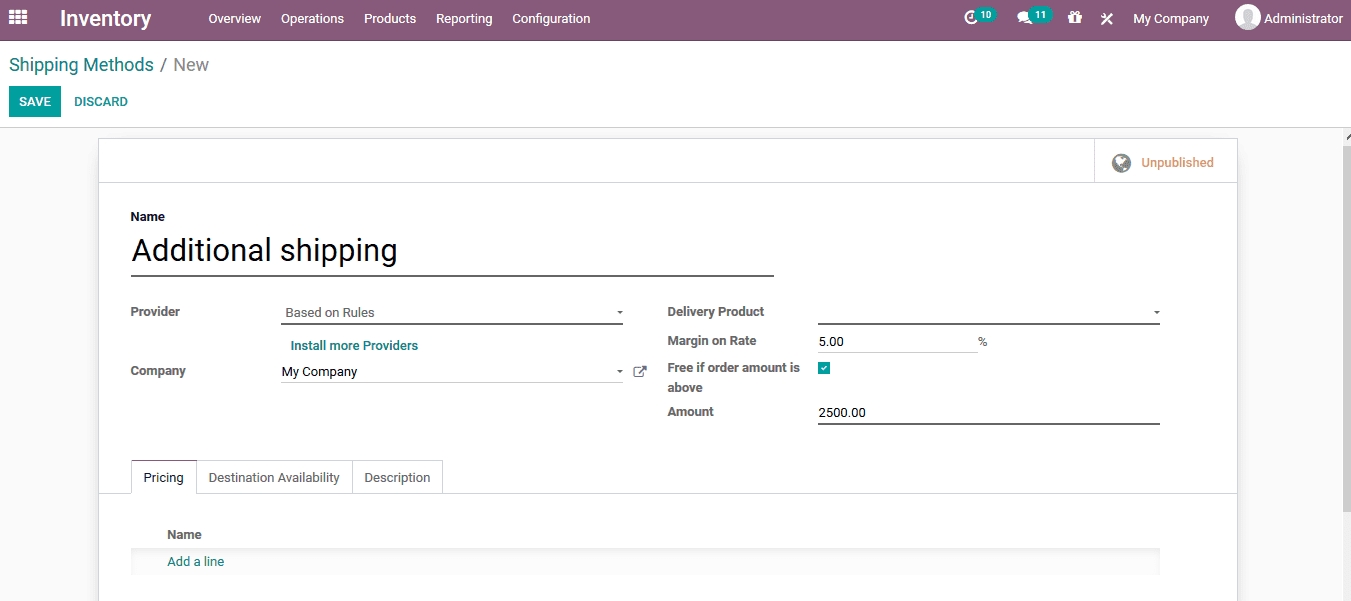 The name of the shipping method, the provider can be set up based on fixed amounts or rules. In case of the rules the rules can be described in the pricing window. On the contrary, in case of fixed prices it can also be described under the provider tab. Delivery products can be assigned along with the margin rate of the operation. In case the user wishes to offer free delivery over a fixed amount it can also be enlisted over here.