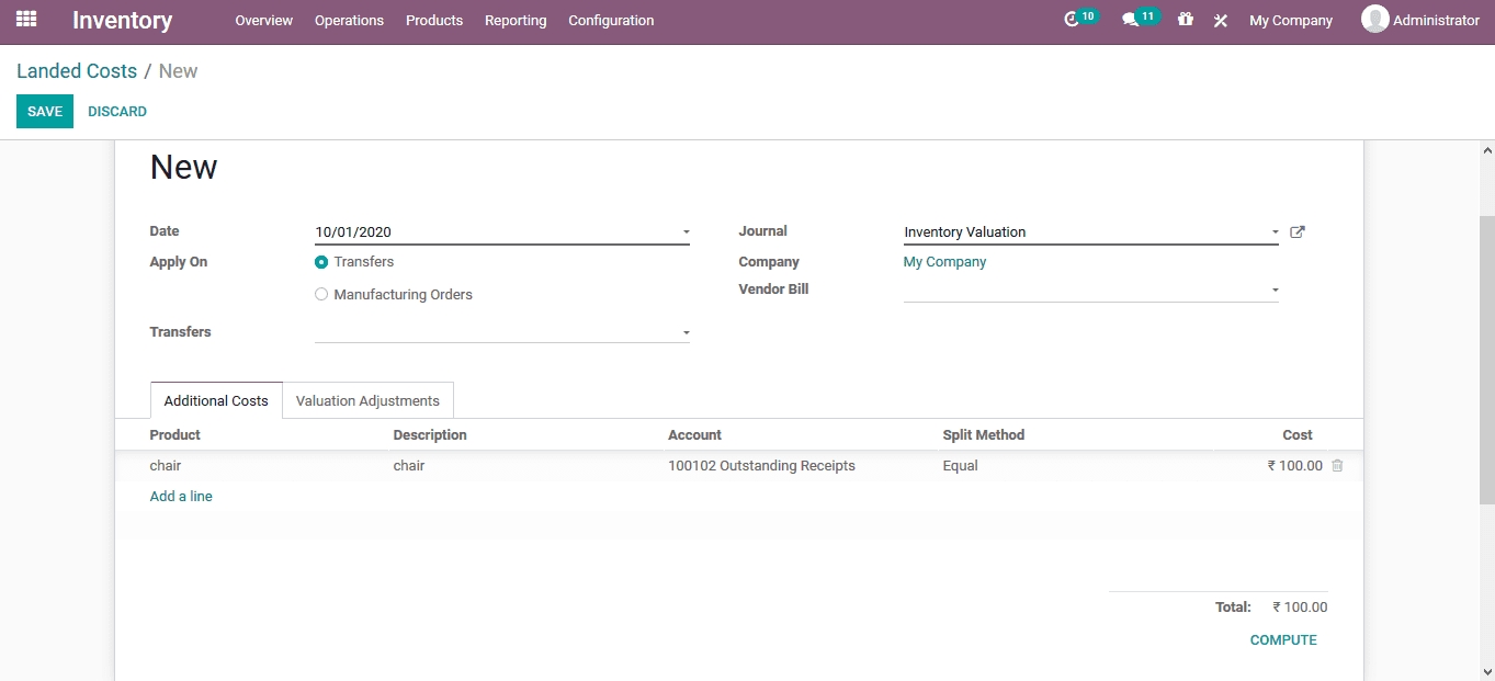 As the landed costs are enabled in the SIMISE platform the user can now define the various landed costs in the landed costs menu available in the operations tab of the inventory module. To create a new landed cost the user can access the create menu available. In the creation menu the user can apply the landed cost on transfer or manufacturing orders, the vendor bill along with the respective journal where the entry should be made can be selected. The respective manufacturing orders or the transfers can be selected for which the landed cost should apply on.