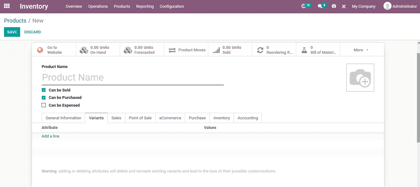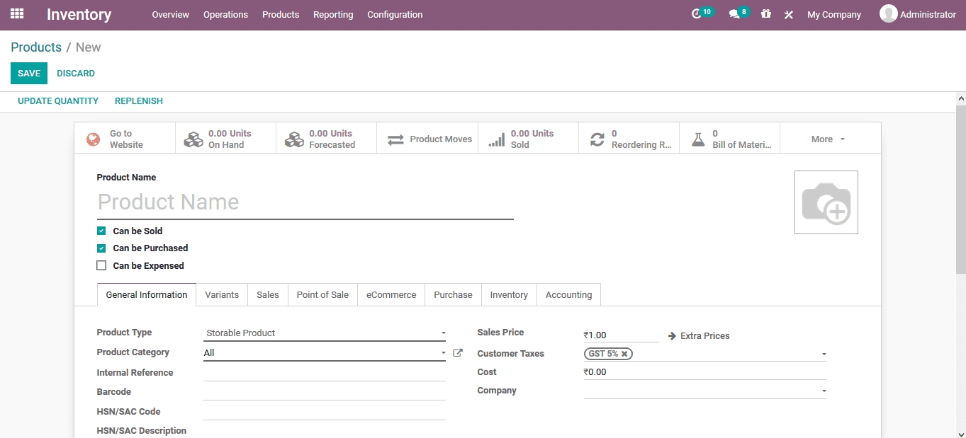 In addition the products can be described as the ones which can be sold, purchased or expensed. There are toggle options in the window from which the user can access the on hand quantity menu, forecasting menu, product moves, reordering rules described, units sold, bill of materials if it's to be manufactured and many more aspects on the product.