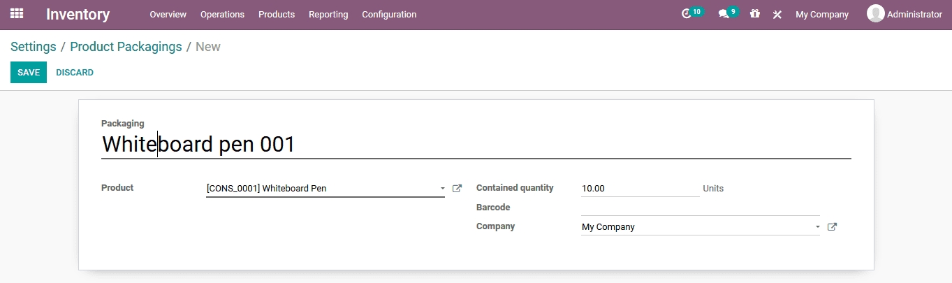 Upon selecting the product packaging option available in the settings menu under the product packing, the user can navigate to the product packaging menu where the various packaging aspects can be created for the operation on the platform. In the packing creation window the user can provide a packaging name, product description, contained quantity, barcode description if any and assign the company if the platform manages the operation of multiple companies.
