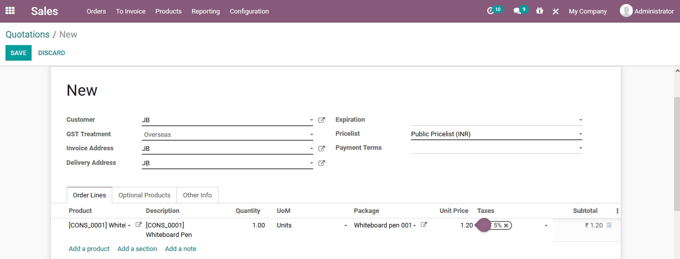 As the product packages are created the user is able to perform the sales quotations as well as the internal product transfer in packages. While created in a sales quotation in the sales module the user will be depicted with the package information at the instance of the respective product being described. The product package can be chosen from the package window.