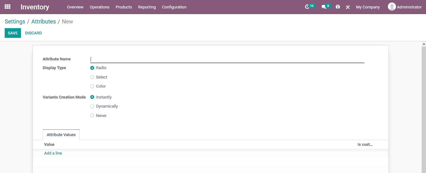 To create a new attribute the user can access the creation menu by selecting the create option available. In the creation menu the user can define the attribute name, display type, variant creation mode and the attribute values.