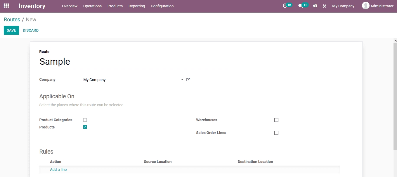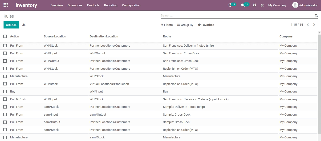 Routes of product movement are described in the product menu under the inventory tab. The route of operations are described during the product creation or are edited as per the operational terminologies of the company.