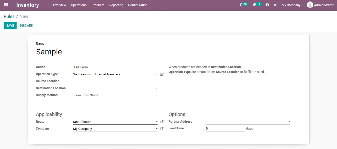 In the creation window the user can provide the rule name, action, operation type, source location, destination location, supply method, applicable route and the lead times for the operation.