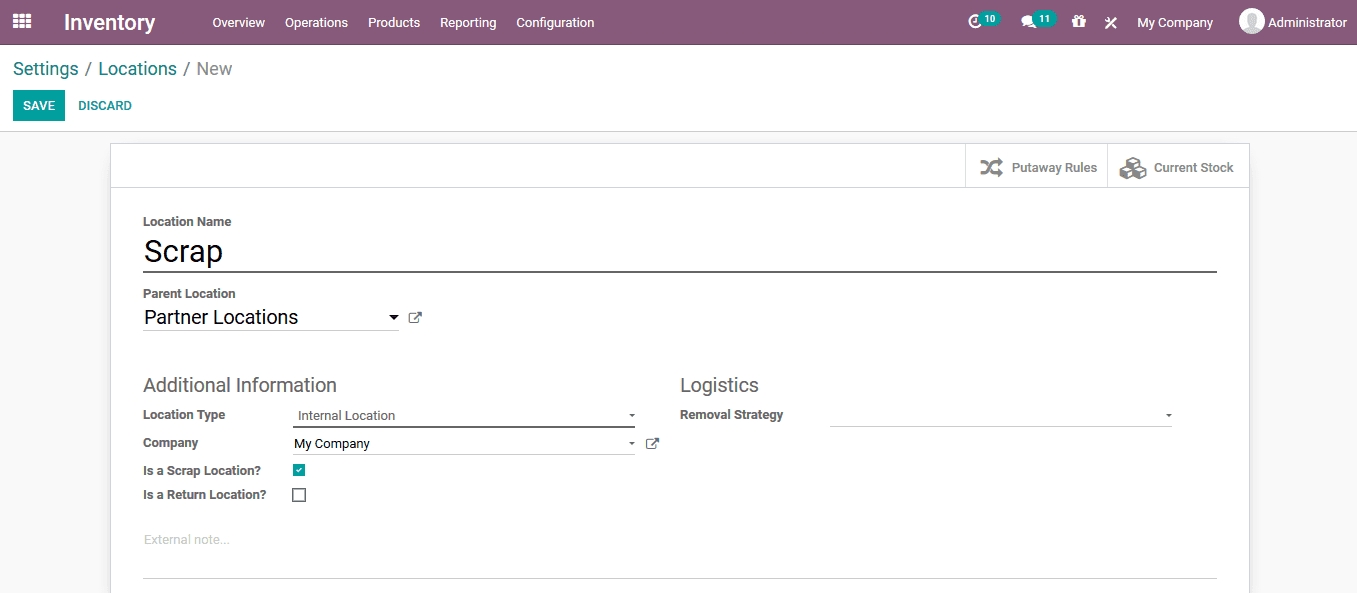 In the creation menu the user can provide the name of the location, allocate the parent location, mention the location type and the company allocated. If the respective location is a scrap one the user can enable the option available. The removal strategies for the location can be mentioned from the default options available in the logistics menu.