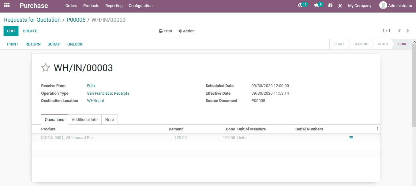 The purchased products unit of measure will not be the same as that of the company described or scaled ones. This difference will create an issue in the inventory operation. But the SIMISE platforms replenish options available will tackle the issue. To illustrate the auto replenishment option available in SIMISE for the unit of measure aspect a purchase quotation can be created. Under the purchase module a new RFQ is created for a product with a different unit of measure than the one described in the platform. To further illustrate the unit of measure for the white board pen as per the platform description is in Units. While the RFQ is described based on dozens. The quotation is used to the vendor and the order is confirmed.