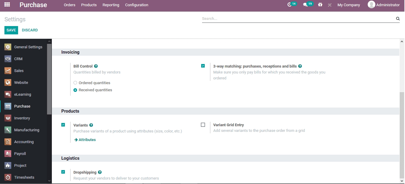 The drop shifting option in the platform can be enabled in the settings menu of the purchase module. Under the logistics menu the user has the drop shifting option which can be enabled or disabled.