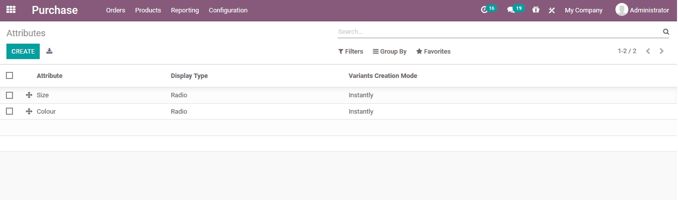 The SIMISE platform allows the users to define the various attributes which will define the product variants in the platform. The product attribute will define the various standards of the same products in terms of size, color material and more. The product attributes menu can be accessed from the configuration menu of the purchase module where all the product attributes will be listed out. The user can edit the ones available and create new ones by selecting the create option available.