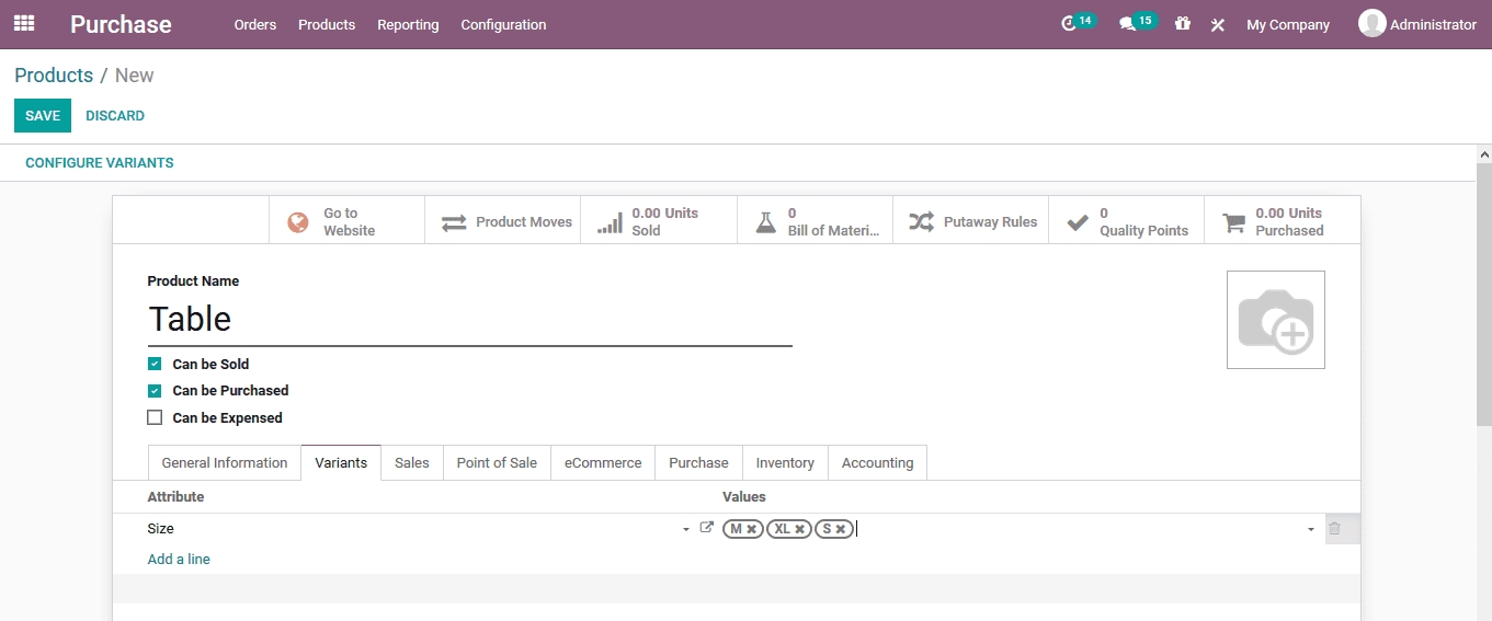 In the product creation window the user can assign a name to the product, choose it be sold, purchase or expensed. There are smart button options available which would direct the user to the company website, product moves menu, the units being sold, the bill of materials menu if it’s a manufactured product, put away rules defined, quality points and the purchased unit’s menu.