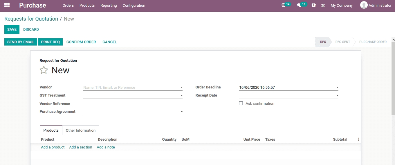 To create a new RFQ the user can access the creation window by selecting the create option available. In the creation window the user can assign the vendor, tax details based on the region, vendor reference and purchase agreement being described in the platform. The order deadline along with the receipt date can be assigned to the RFQ. The products required can be mentioned in the product menu along with the variants and the required quantity. In addition, under the other description tab the user can provide the financial description on the same.