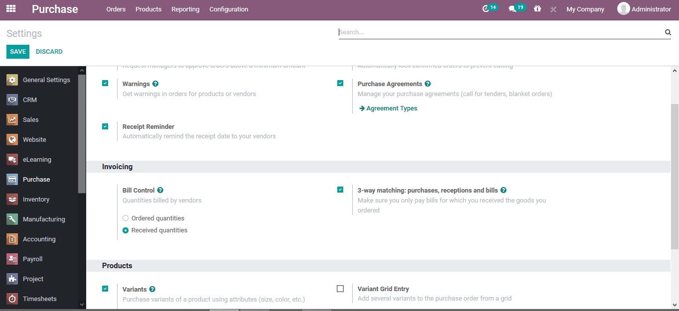 The billing or the payment for the purchases made are direct to the vendors. The user can generate vendor bills in the platform and provide payment for the respective ones. The vendor bills in SIMISE can be derived based on the delivered quantity or the ordered quantity. This can be defined in the settings menu of the purchase module under the invoicing tab. In the menu the user can either choose the bill control to be based on ordered quantities or received quantities.