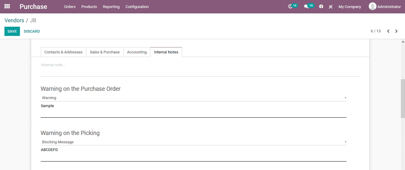 As the warnings are enabled in the platform the user can now allocate custom made messages for the products and the vendors. In case of the vendors under the vendor menu the user can choose a respective product and in the internal nodes of the respective vendor description the warnings on purchase and warnings on picking can be allocated. The warnings can be custom made and be provided as warning messages or blocking messages which can be closed as the warnings.