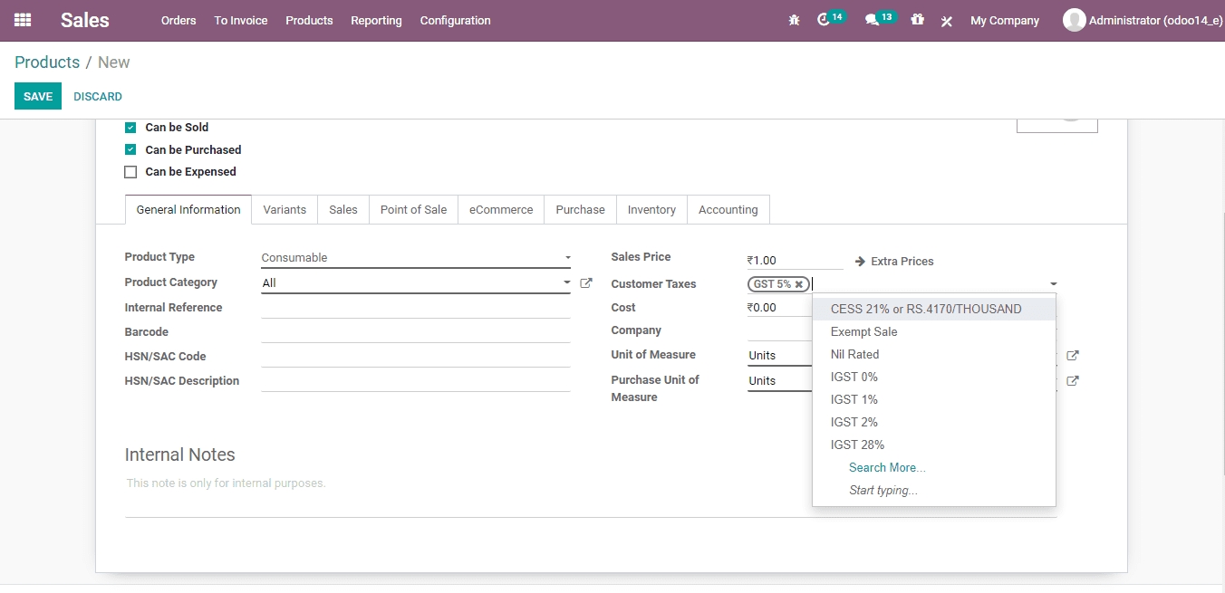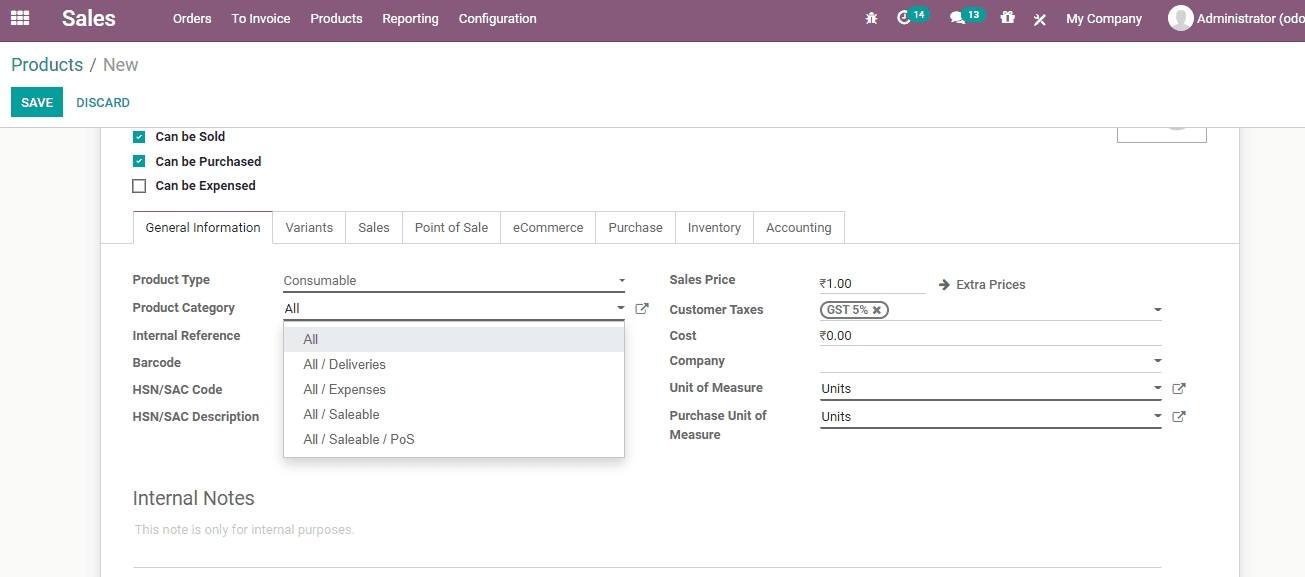 Product Types: It falls under the general information tab. SIMISE gives three options for product types. They are consumables, service and storable products.