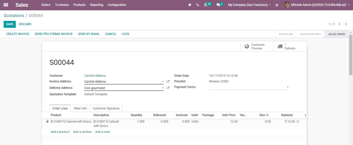 A pro-forma invoice can be sent from any quotation or sales order.